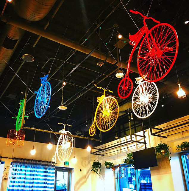 Rideable Bicycle Replicas has been making antique cycle and modern-style cycle items for riding and many other reasons for more than 45 years now. What these pieces can be used for is only limited by the imagination of the people using them. Many people and businesses want to use these old time looking bikes as décor or advertising pieces, and we help them to do that by making custom bikes, parts, signs, and decorations, or by just supplying the items they need to do what they want themselves. Have a look at these pictures to see just a few ways we can help you make a spectacular display or cycle themed decorative signage piece.