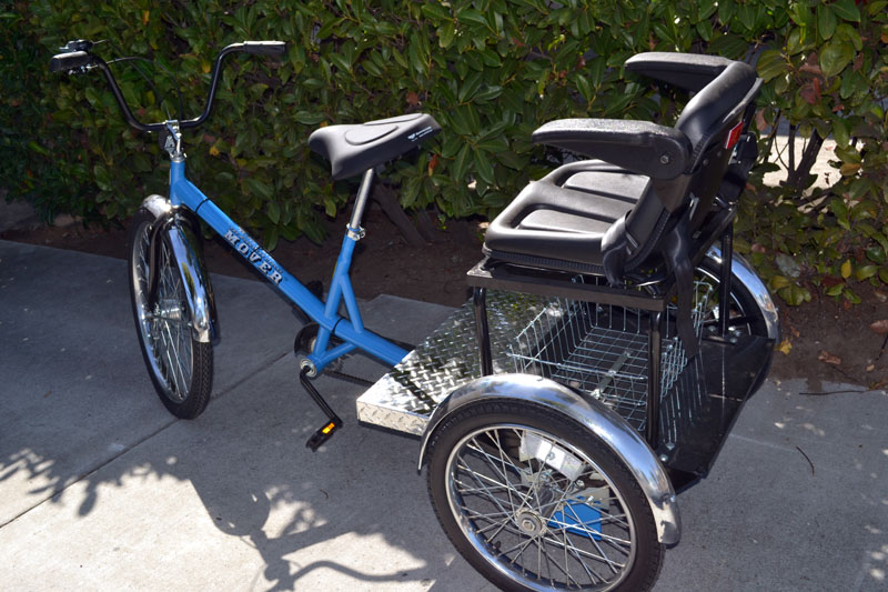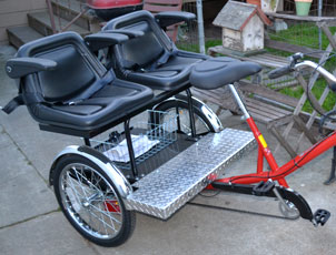 ^ Shown above is the newly revised Family Single Chariot (Single rear seat). Now better than ever! Imagine doing your errands, or riding through your neighborhood along with your child or other passenger on this unique and durable vehicle. All the great features of the classic Mover M2620-3CB, a time proven and durable commercial grade trike that's built to last. Simple to operate and maintain, combined with a comfortable rear seat for your passenger (up to 5'9" recommended). The MVPC-3CB comes with the following standard features: 3 Speed coaster brake, Front Drum Brake (with parking brake), Front and Rear Mudguards (fenders), thickly padded wide saddle, rear basket, thickly padded high back child/tractor seat with lap belt and swivel down armrests, WTC clincher wheels, 11 g spokes, 7/8" axle and all the heavy duty features that make Worksman Cycles the most respected tricycles on earth.